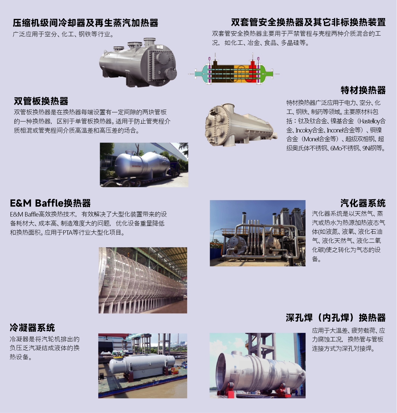 雙良換熱器事業部,致力于各種換熱裝置的研發、設計與制造,為客戶提供從計算選型、設計制造、安裝、驗收認證等全過程服務。主要產品有壓縮機級間冷卻器、再生蒸汽加熱器、雙管板換熱器、冷凝器系統、汽化器系統、E&M Baffle換熱器、特材換熱器、深孔焊(內孔管板對接焊)換熱器、雙套管安全換熱器、ORC系統換熱裝置、表冷器、熱管換熱器、非標定制特種換熱器等其它各種非板式換熱裝置。擁有全球主流壓力容器制造資質及認證。擁有各種技能的高水平焊工隊伍和進口高品質焊接設備,可焊接制造鈦合金、鎳基合金、銅及銅鎳合金、雙相鋼、超級雙相鋼、鋁、低合金鋼等各種金屬材料。已為西門子、曼透平、神戶制鋼、阿特拉斯、托普索、林德、法液空、美國空氣化工、現代工程、印度石油、德希尼布等世界500強企業提供了上萬臺換熱設備,產品遍布中國、歐洲、美洲、日韓、東南亞、中東、俄白哈等世界各地,服務于石化、煤化、鋼鐵、光伏半導體等眾多大型工程。